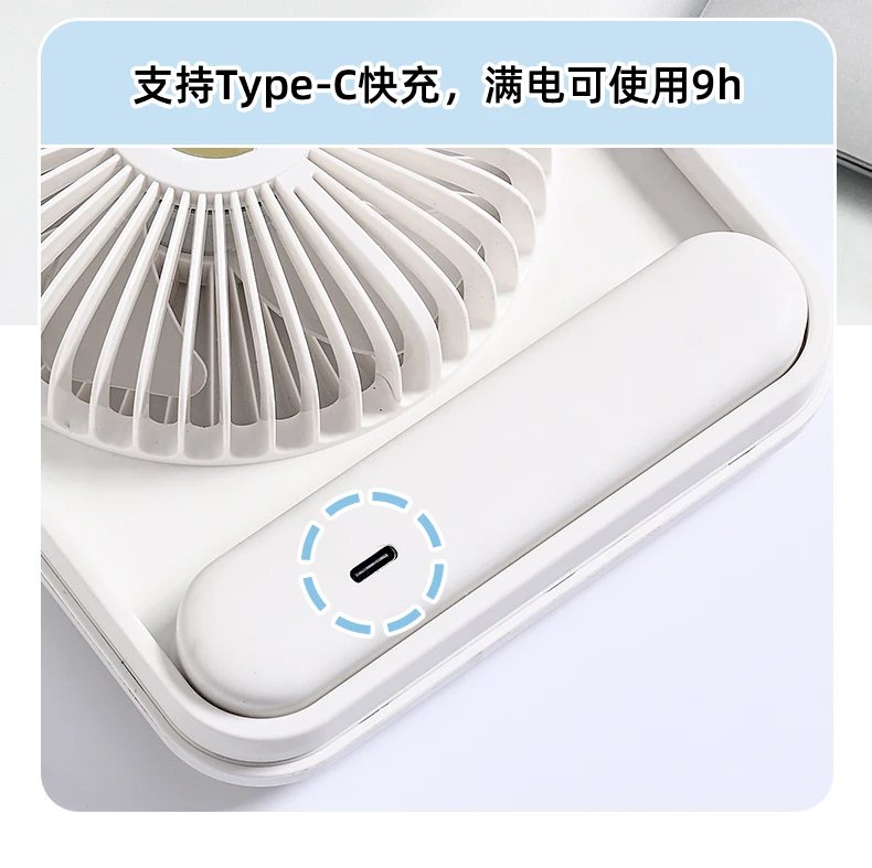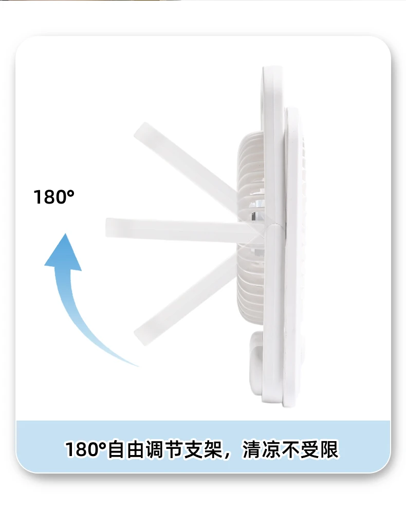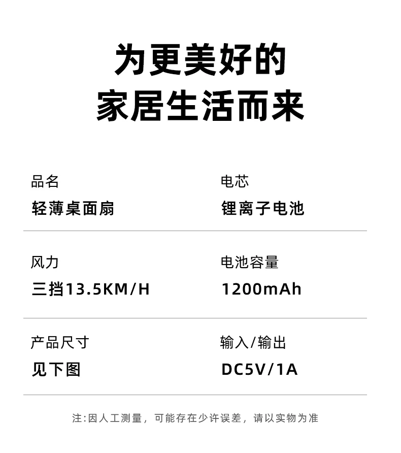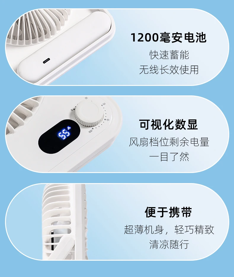 Material: ABS Size: 5 inches Input: 5V1A Power: 5W Gears: 3 gears Wind speed: 4m/s Noise: 36db Battery capacity: 1200mAh Fan type: Desktop